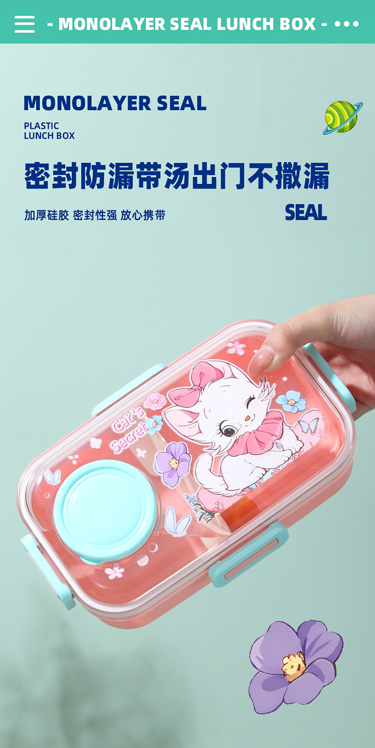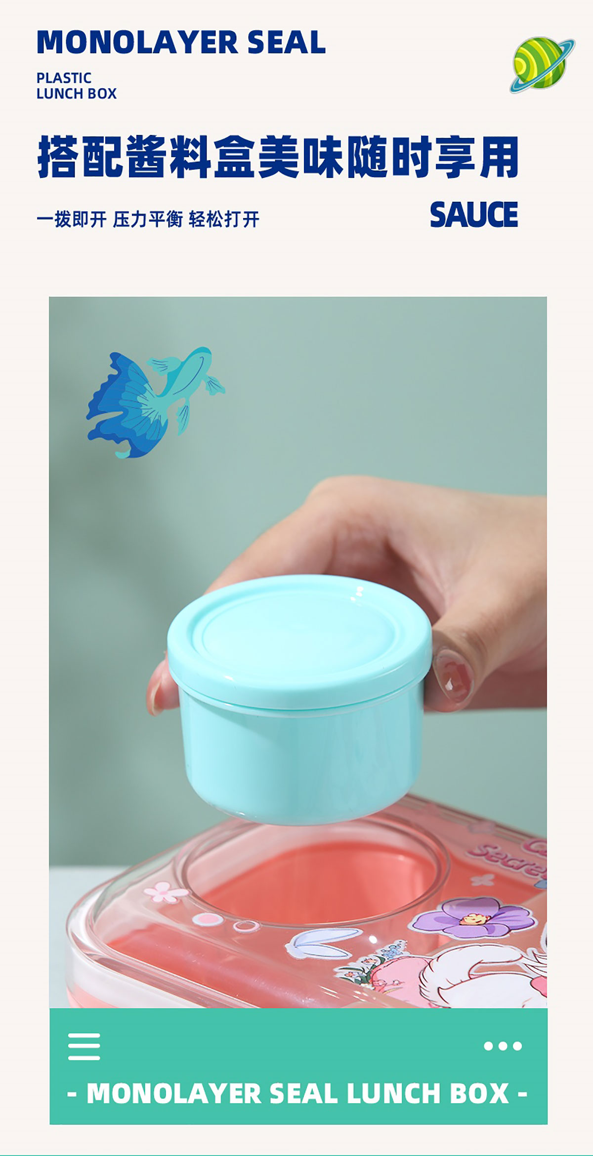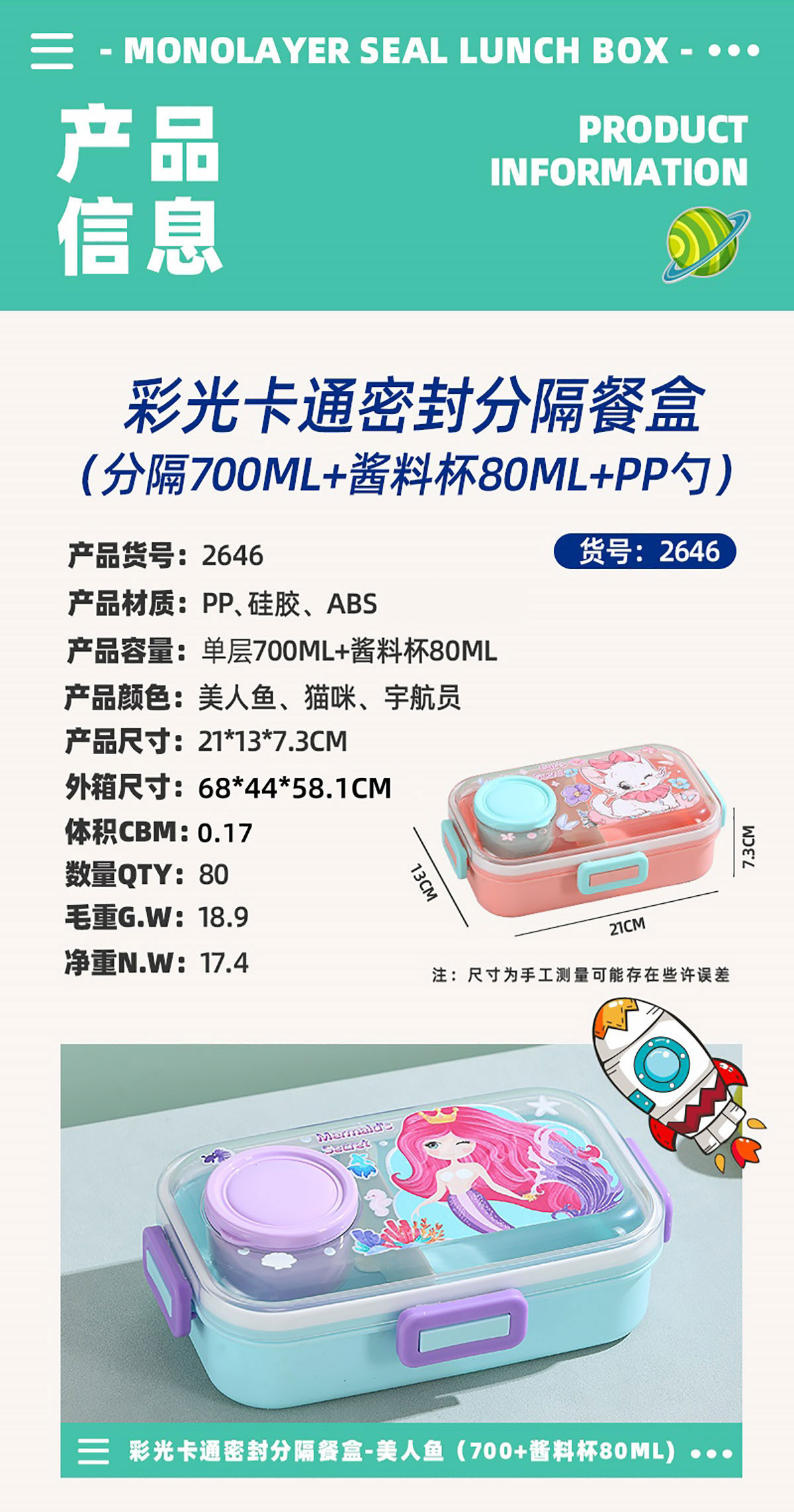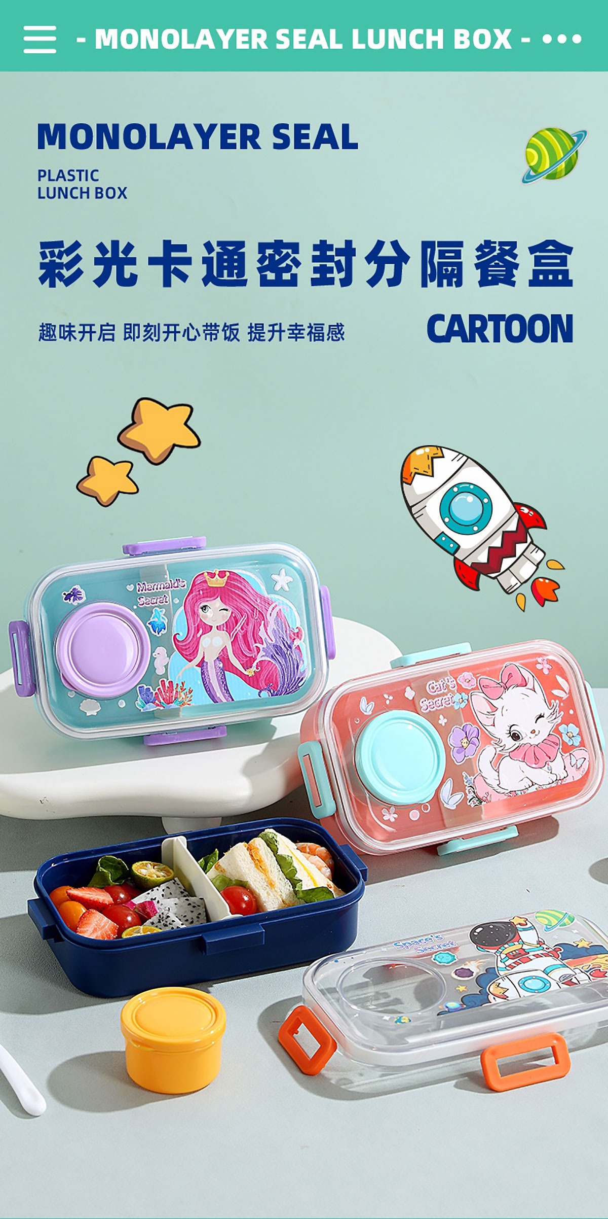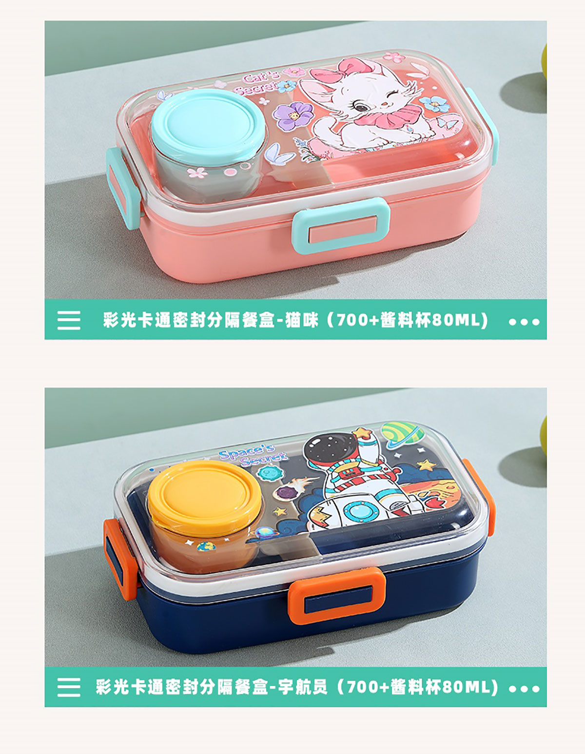 彩光卡通分格密封餐盒(700ml+外置醬料杯80ml+pp勺)