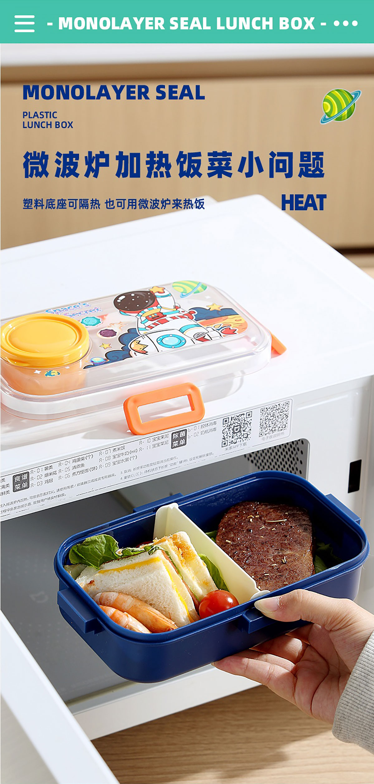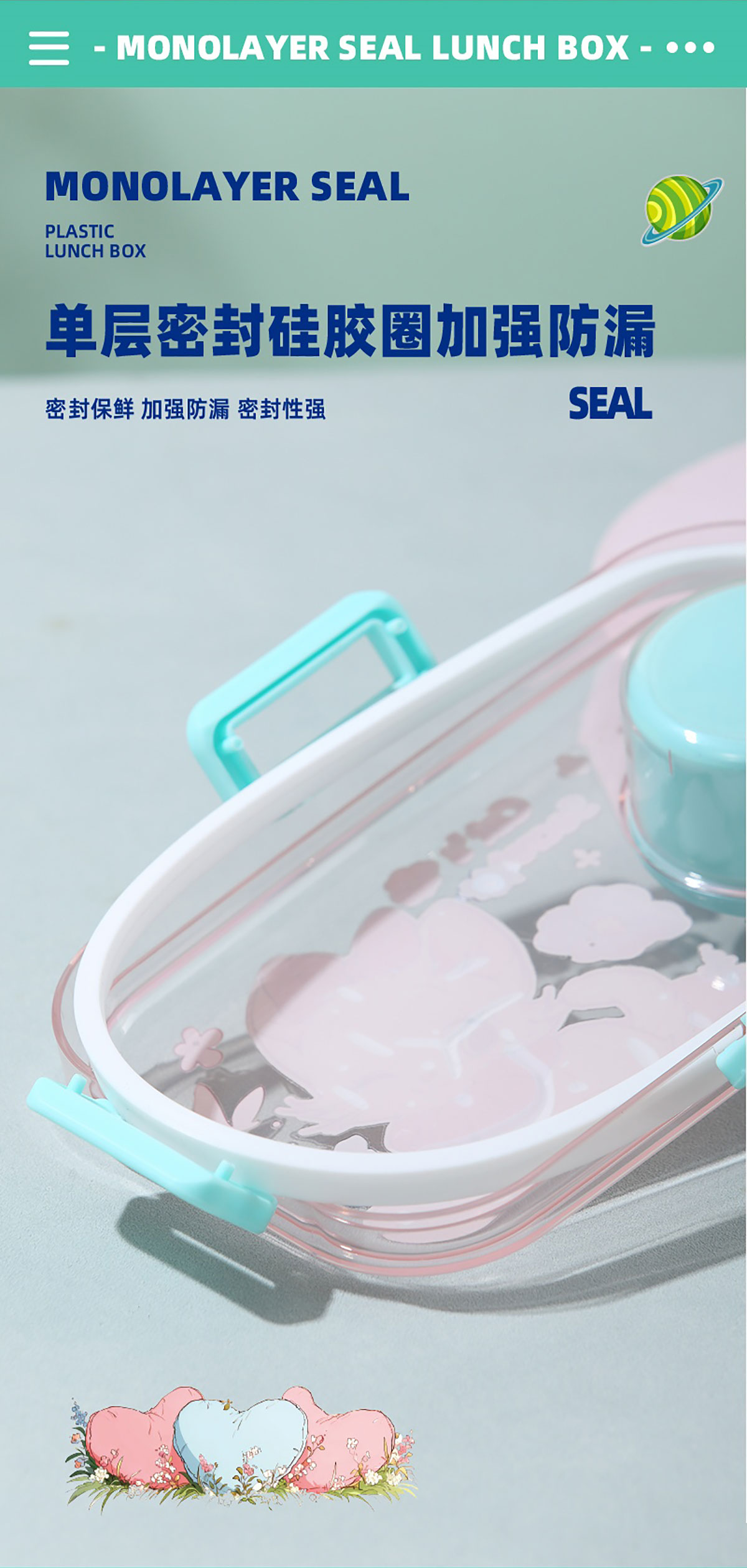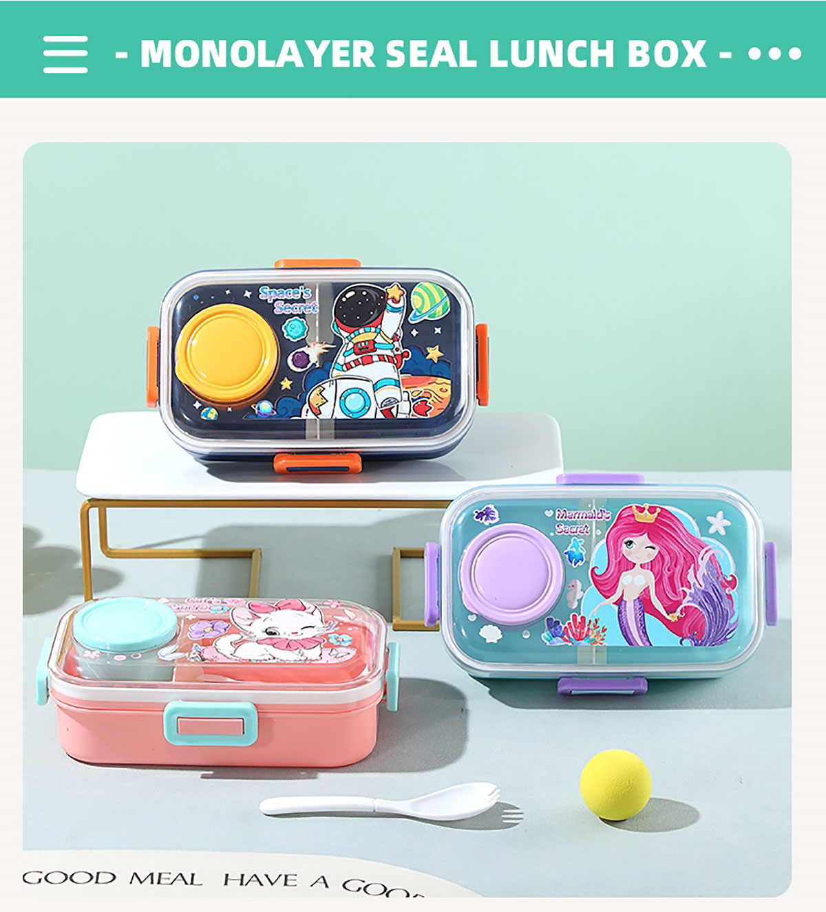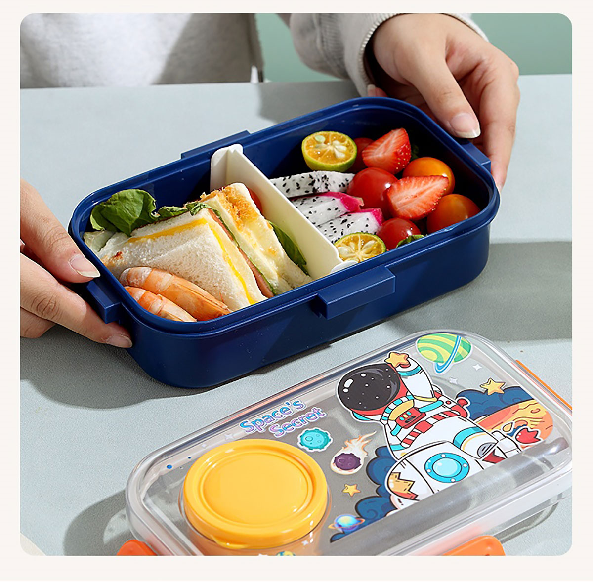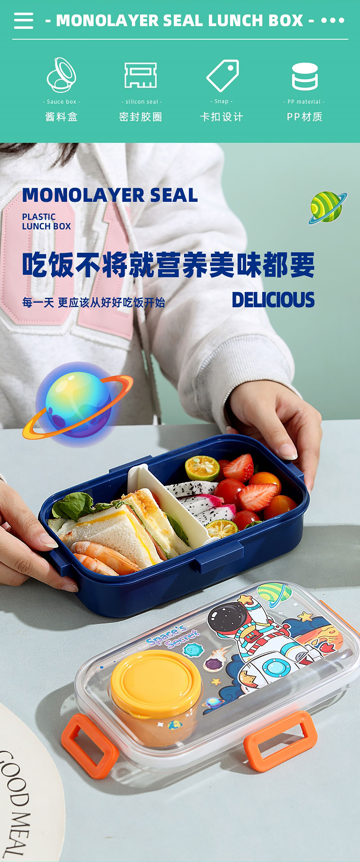 彩光卡通分格密封餐盒(700ml+外置醬料杯80ml+pp勺)